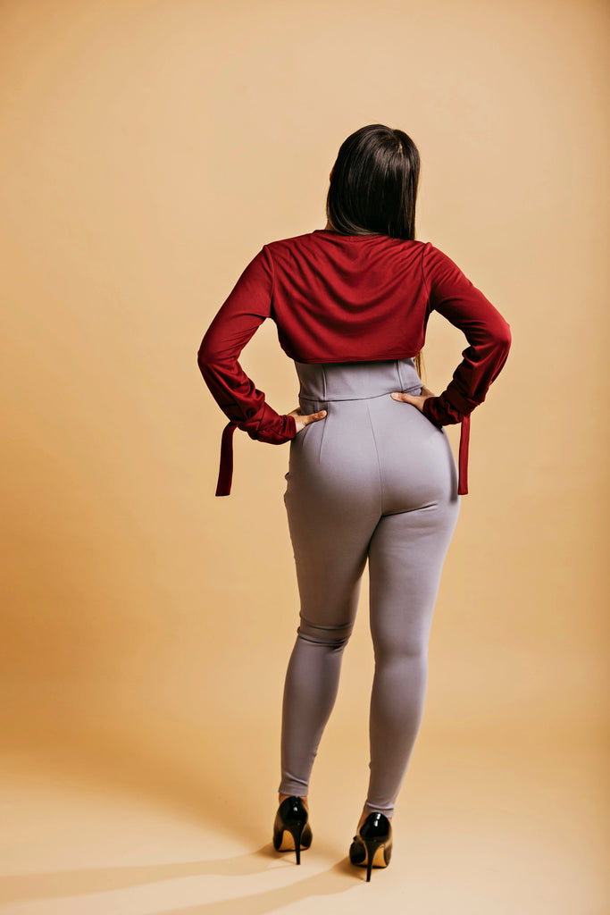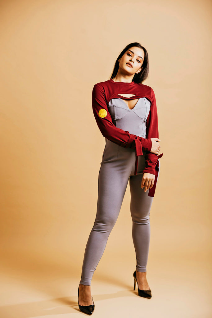 • L dydis: kombinezonas: krūtinės apimtis 95cm, kaušelio dydis C, liemens apimtis 79cm, apatinės dalies ilgis nuo liemens 100cm. crop top: nugaros plotis 36cm, rankovės ilgis 63cm;